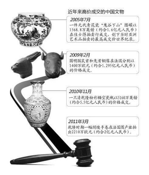 據(jù)聯(lián)合國(guó)教科文組織統(tǒng)計(jì),流失到中國(guó)境外的中國(guó)文物約164萬件,分散在全世界47家博物館,海外民間的收藏預(yù)計(jì)是館藏的10倍。近年來,中國(guó)文物成了拍賣市場(chǎng)的搶手貨,價(jià)格動(dòng)輒上千萬。
