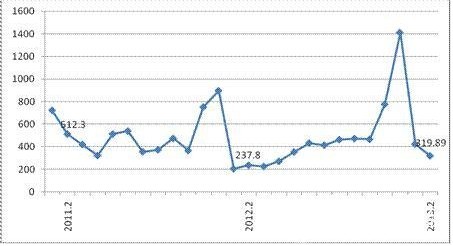 2月份,全國拍賣業(yè)實現(xiàn)成交額319.89億元,同比2012年增長34.5%,同比2011年仍然下降,降幅為37.6%。受春節(jié)長假因素的主要影響,2月全國拍賣成交場次較1月減少了1601場,成交額環(huán)比1月減少104.2億元,環(huán)比降幅為24.6%。(見圖1)
