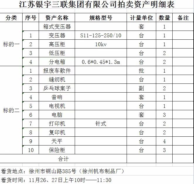 2、銀宇三聯(lián)集團(tuán)廢舊物資一批,主要包含:變壓器、高低壓柜、報(bào)廢車散件、電腦、辦公設(shè)備等。