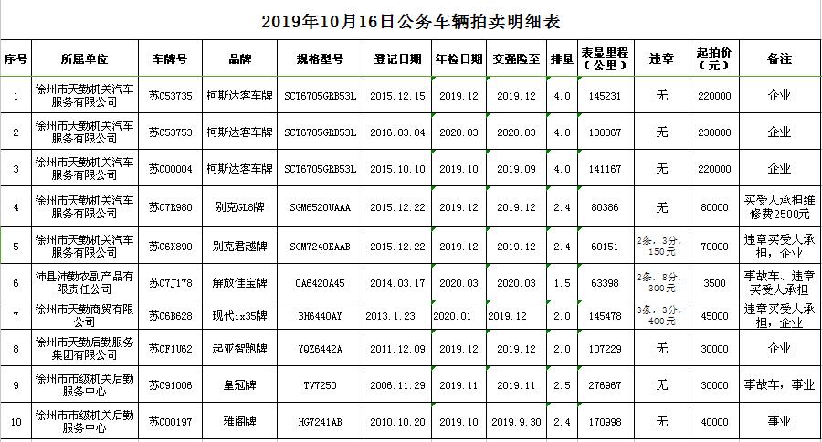 關(guān)注微信公眾號(hào)受委托,我公司定于2019年10月16日13:00時(shí)在徐州市銀地二手車(chē)交易市場(chǎng)四樓東南拍賣(mài)大廳通過(guò)現(xiàn)場(chǎng)和汽車(chē)街網(wǎng)絡(luò)拍賣(mài)平臺(tái)同步進(jìn)行的方式公開(kāi)拍賣(mài)以下公務(wù)車(chē)輛: