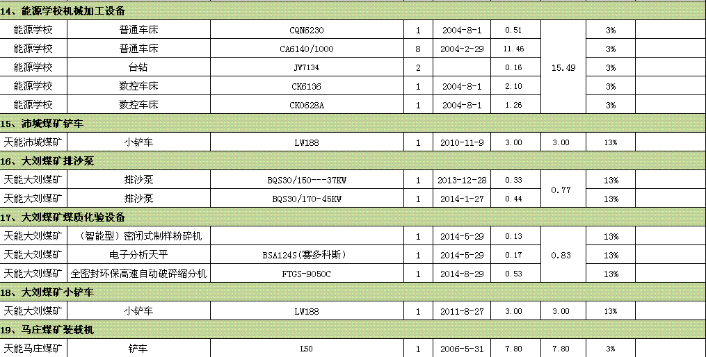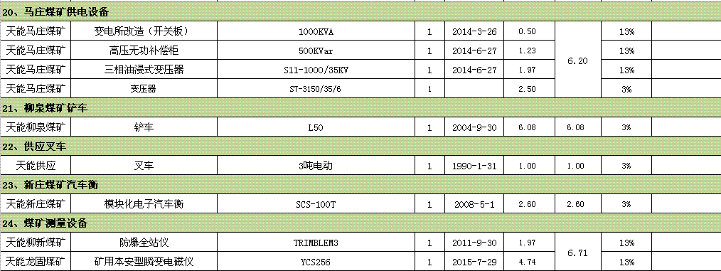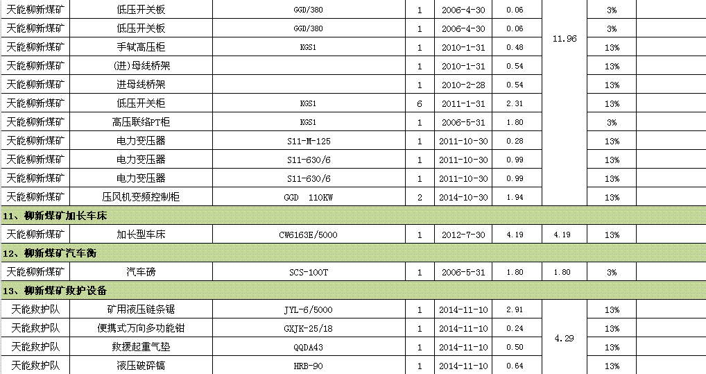 裝載機(jī)、鉆床、車床、提升機(jī)、壓風(fēng)機(jī)、行車、綜掘機(jī)、變壓器、開關(guān)柜、鏟車汽車衡、測(cè)量設(shè)備等。