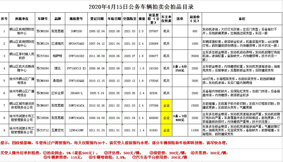 關(guān)注微信公眾號受委托,我公司定于2020年4月15日13:30時在徐州市銀地二手車交易市場四樓東南拍賣大廳通過現(xiàn)場和汽車街網(wǎng)絡(luò)拍賣平臺同步進行的方式公開拍賣以下車輛:①05年蘇CM0288君越;②07年蘇CM5129江淮瑞風(fēng);③11年蘇C5726G帕薩特;④10年蘇CM6067君越;⑤08年蘇C38586君越;⑥11年蘇C53712五菱宏光;⑦08年蘇C5609G捷達;⑧10年蘇CM0049桑塔納;⑨05年蘇CM2898江鈴全順。