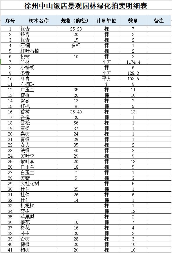 關(guān)注微信公眾號(hào) 受委托,我公司定于2021年5月8日10通過中拍平臺(tái)公開拍賣:徐州市中山飯店景觀樹一批。主要包含:銀杏、廣玉蘭、冬青、紫薇、香樟、梨樹、松鼠、青桐、女貞、法桐、白玉蘭、杜仲、水杉、冬青、海棠、竹林等。