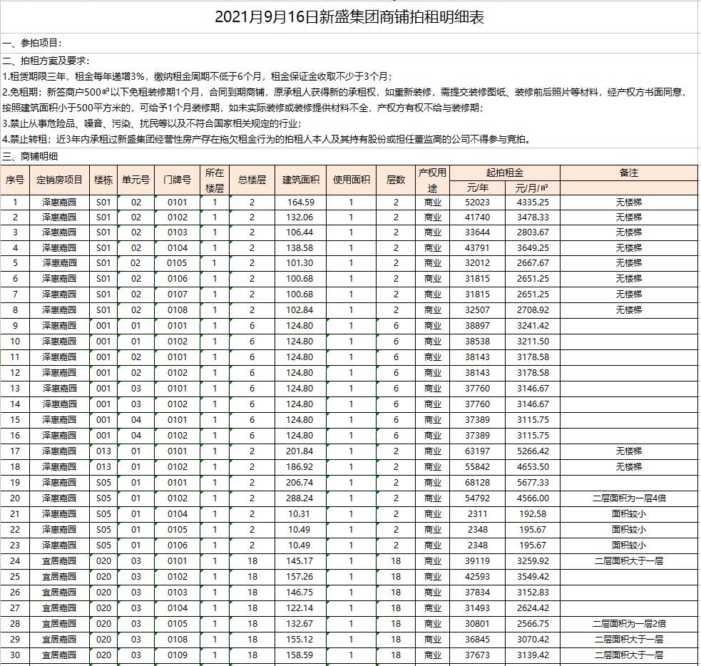 關注微信公眾號我公司受委托,定于2021年9月16日9:30時在徐州市中山南路55號本公司拍賣廳公開拍租以下商鋪:澤惠嘉園23間、宜居嘉園21間、和風雅致7間。面積分別約為數十至三百余平米不等,租期均為三年。